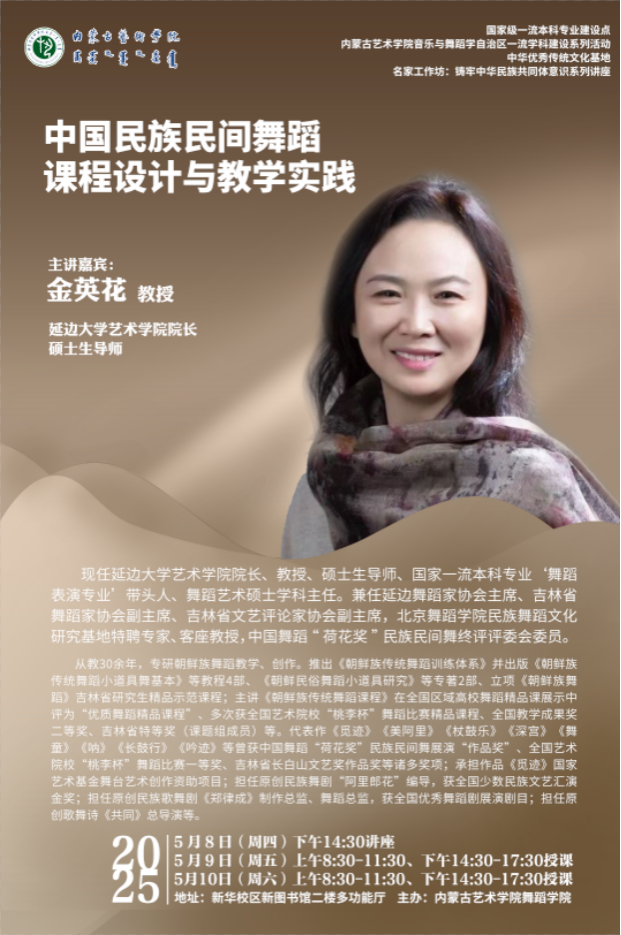 5月9日至10日,金英花教授开始了为期两天的朝鲜族舞蹈研习课程,结合我院研究生《中国民族民间舞蹈课程设计与教学实践》的课程要求与朝鲜族舞蹈基础,教授了朝鲜舞“古格里”长短的代表性组合:《步法组合》《围手与扛手组合》《汗衫舞基础(道嘚里)》,以及朝鲜族“扎津莫里”长短代表性的《移动步法》。 5月10日下午,金英花教授大师课汇报展示顺利进行,同学们的学习热情得到了金英花教授的高度评价。汇报结束后我院教师与金英花教授展开了别开生面的教学研讨,同学们也积极发表学习心得与感受,并表示经过两天的朝鲜族舞蹈课程学习,进一步认识了朝鲜族舞蹈内在的人文基因,也更加深刻地体会到中华民族多元一体的民族情怀。