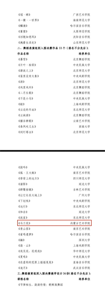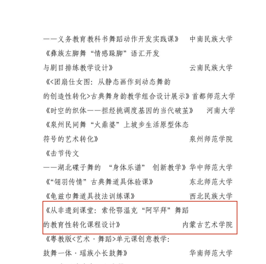 此次我校入围的作品有 舞蹈表演组别作品《马兰花》,舞蹈教育组别教学设计《从非遗到课堂:索伦鄂温克 “阿罕拜” 舞蹈的教育性转化课程设计》,聚焦非遗文化的传承与发展,既彰显了非遗文化的深厚底蕴,也体现了我校研究生教育在 “文化传承与创新” 领域的积极探索,为高校舞蹈教育与非遗保护融合提供了有价值的实践思路。